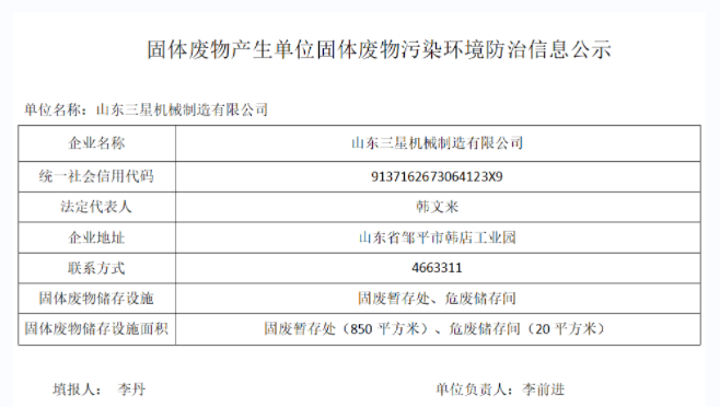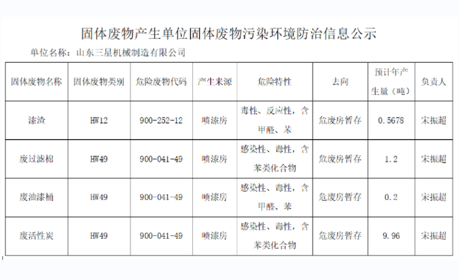 山東三星機(jī)械制造有限公司危險廢物污染防治信息公示(2023)